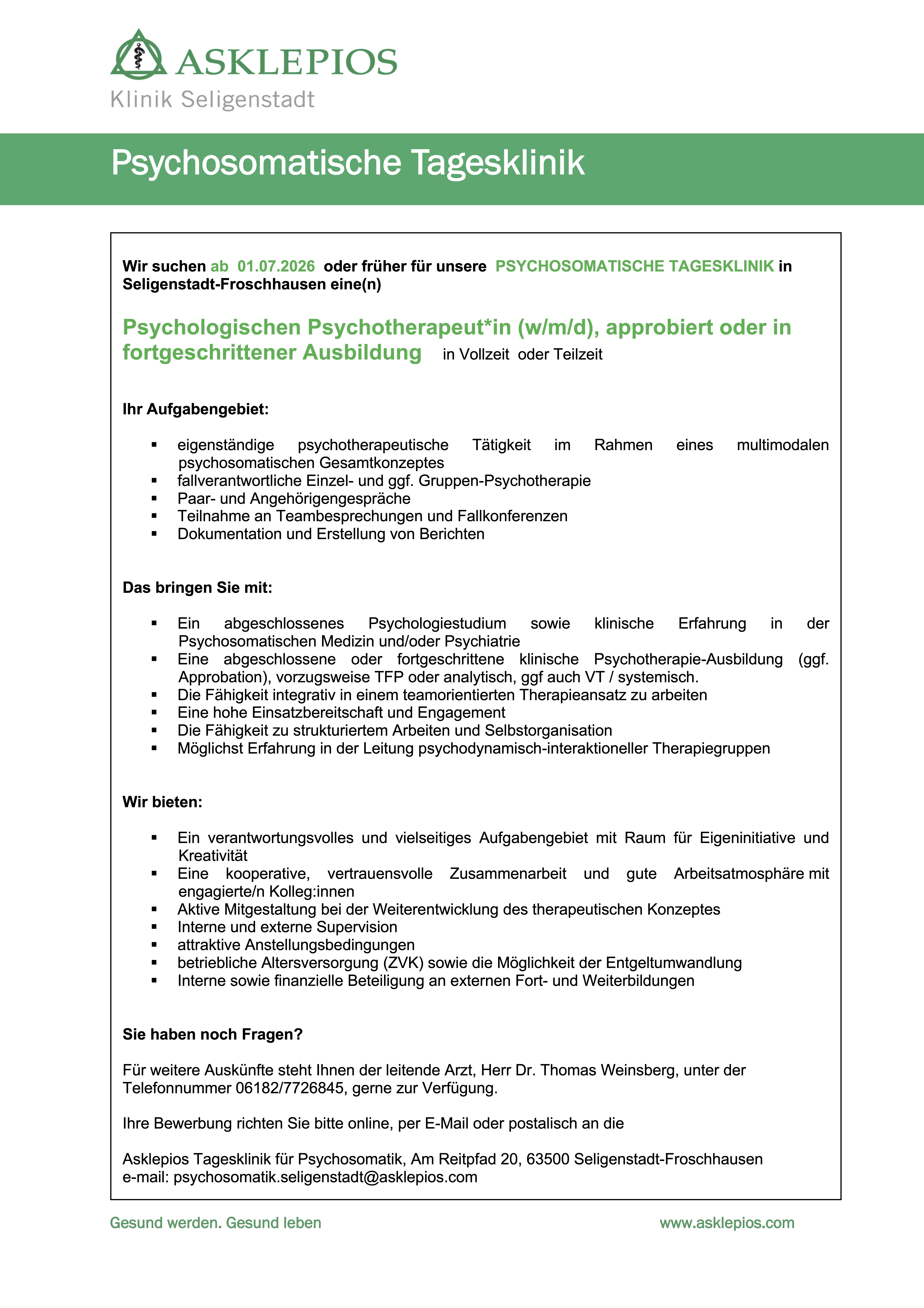 Psychologischer Psychotherapeut*in (w/m/d), approbiert oder in fortgeschrittener Ausbildung